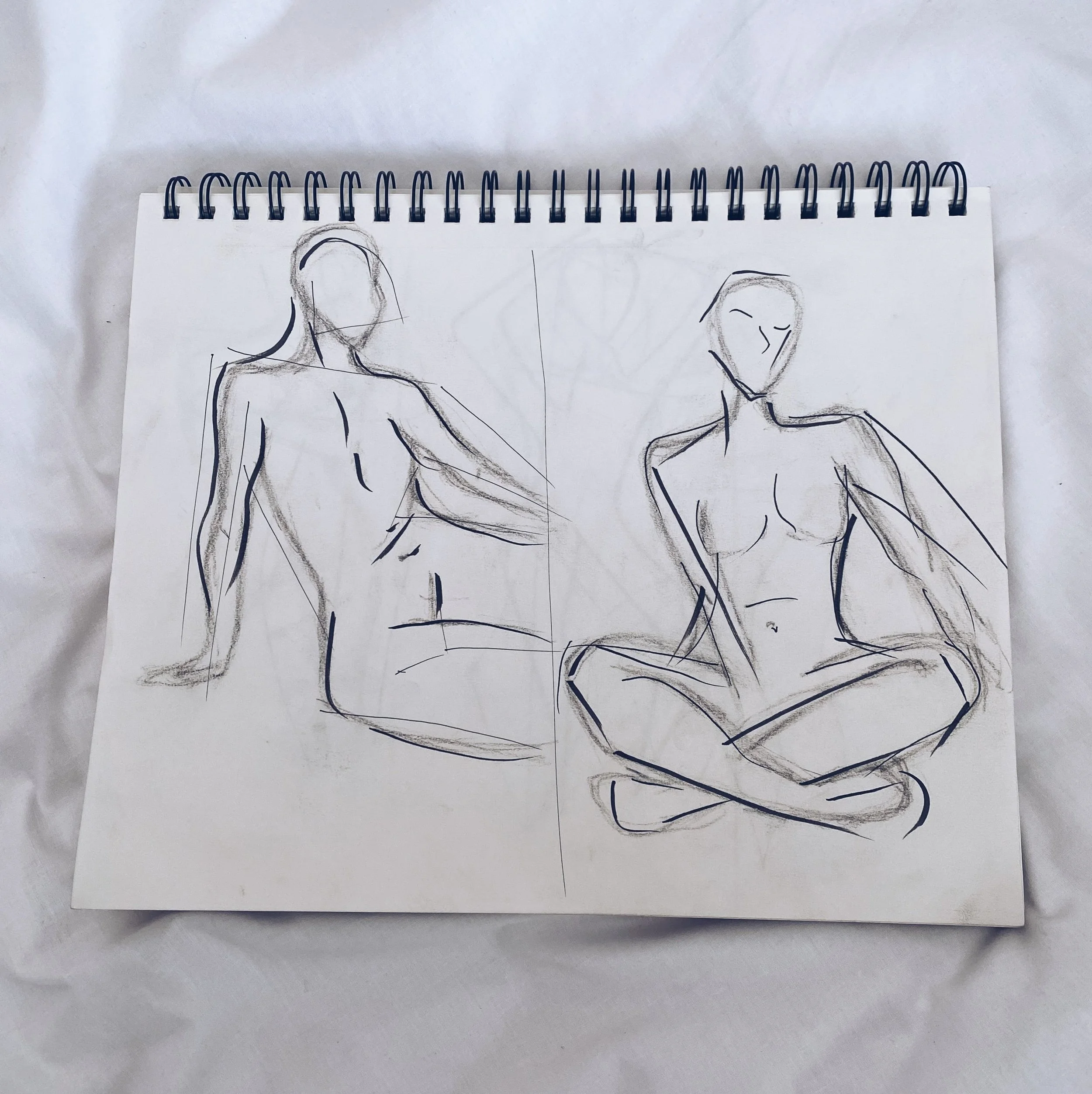 After class, you undress yourself to shower after a long day or an evening of bending over a drawing board and you perceive your own body differently. Each dimple and pore becomes something you’re curious about rendering on a page. You wonder how another artist would see and depict the fold in the right side of your back, a deeper crease than the one that exists on the left side. You go for more classes, render the unique silhouette and posture of more humans’ nude bodies and wonder what it would be like to stand in front of a room of 11 people, or more, and have 22 pairs of eyes, or more, focused on your breasts, your thighs, your shoulder blades, your whole entire form.